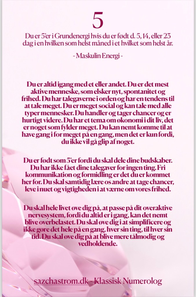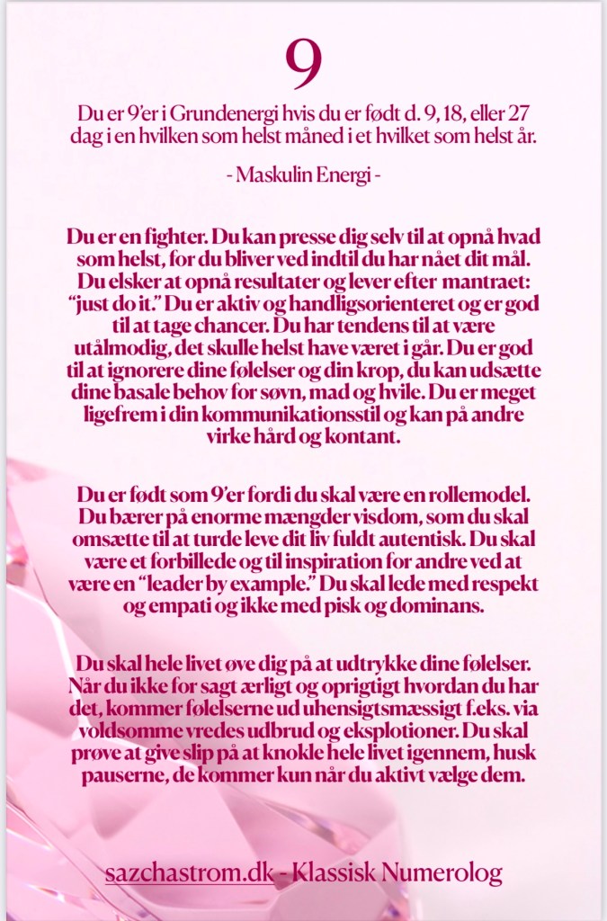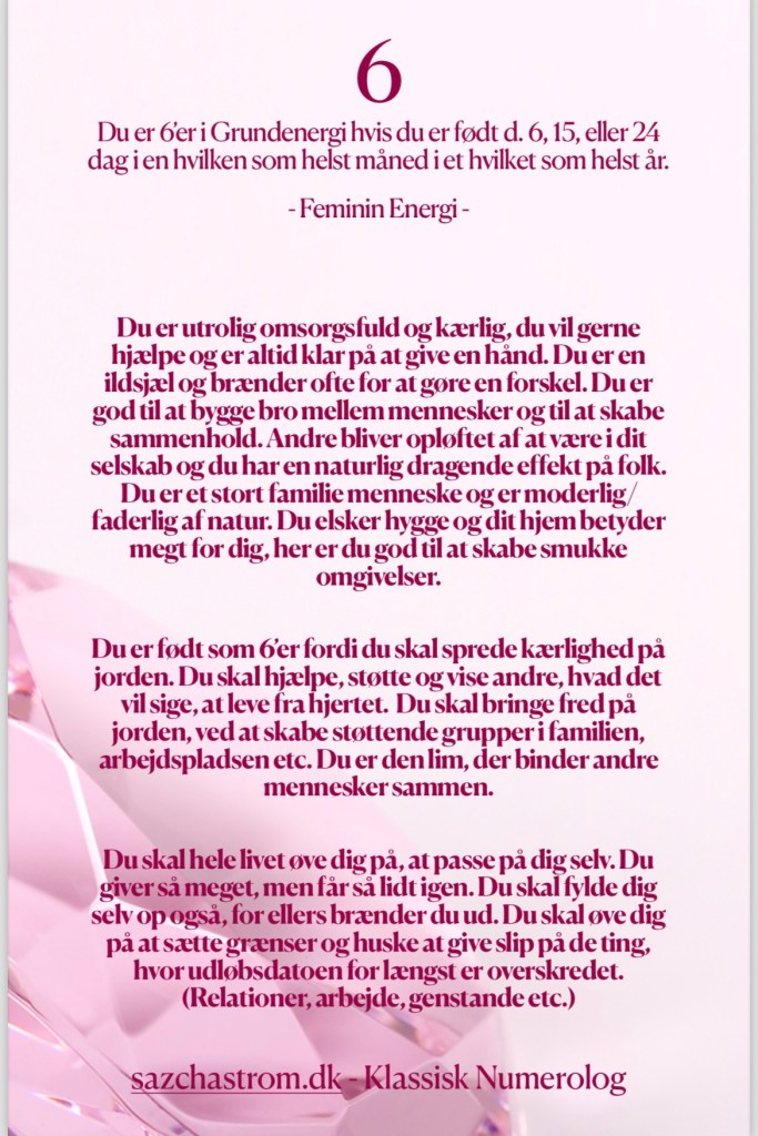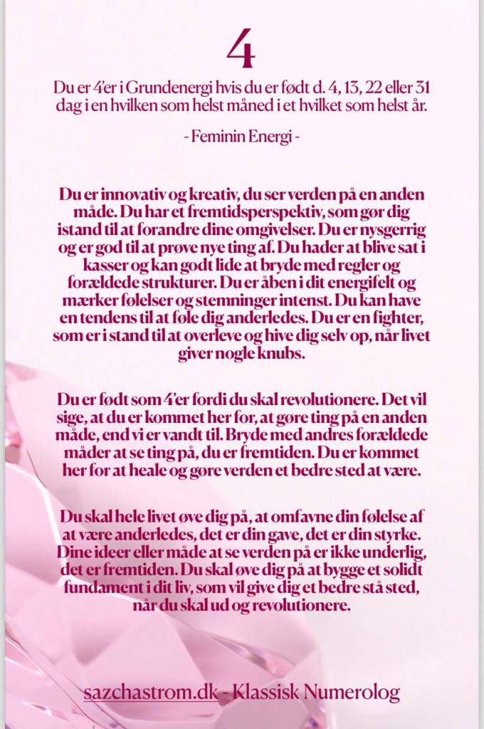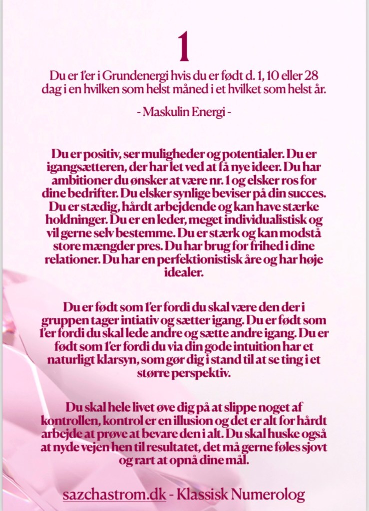 Nedenfor kan du blive lidt klogere på din Grundenergi. Hvis du ønsker at vide noget om din Månedsenergi, din Årsenergi eller din Sjælsenergi, så hop ind og book en Numerologisk Tolkning under fanen “Sessioner”.